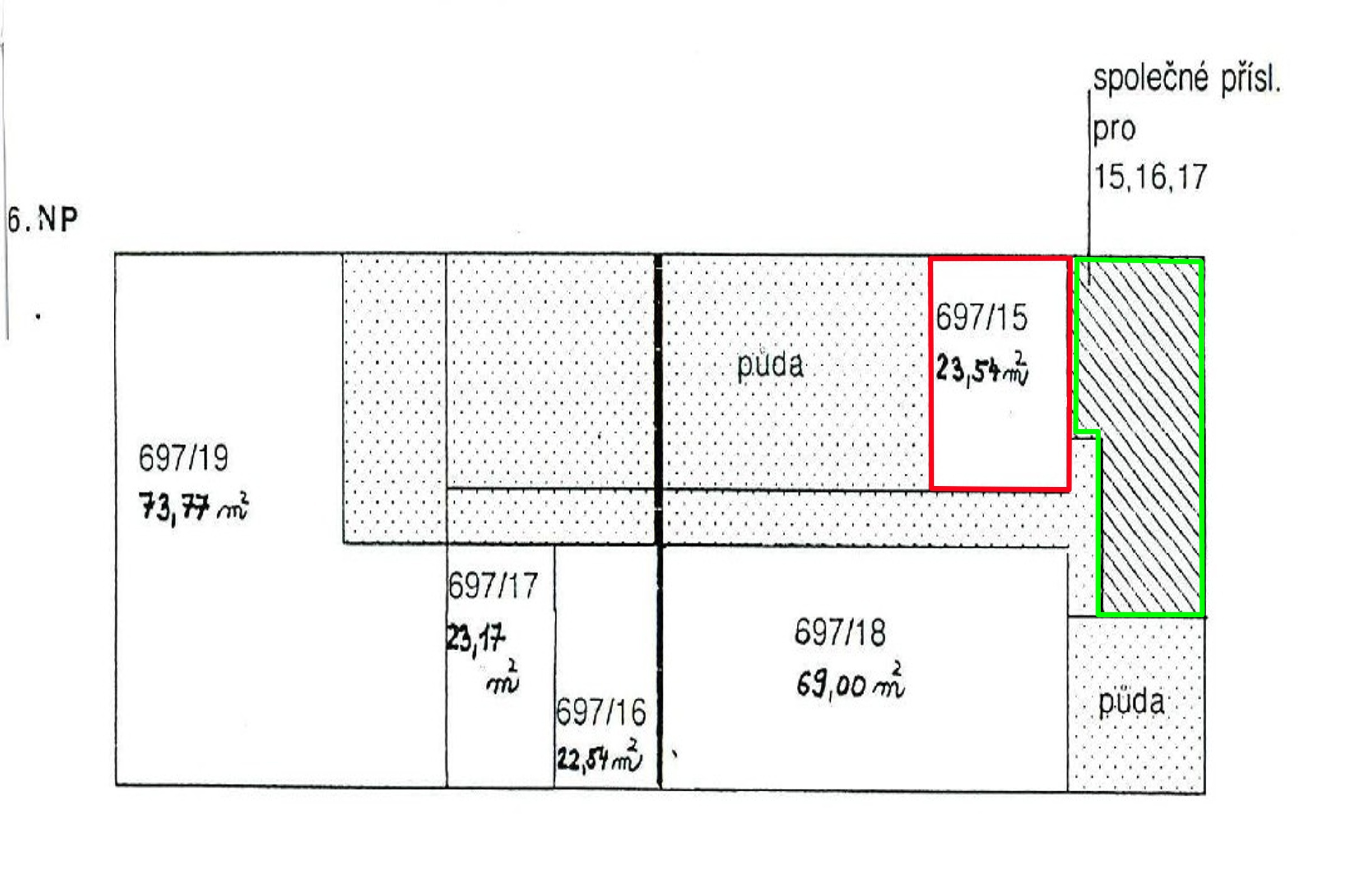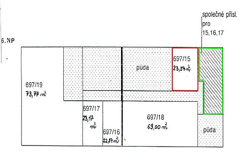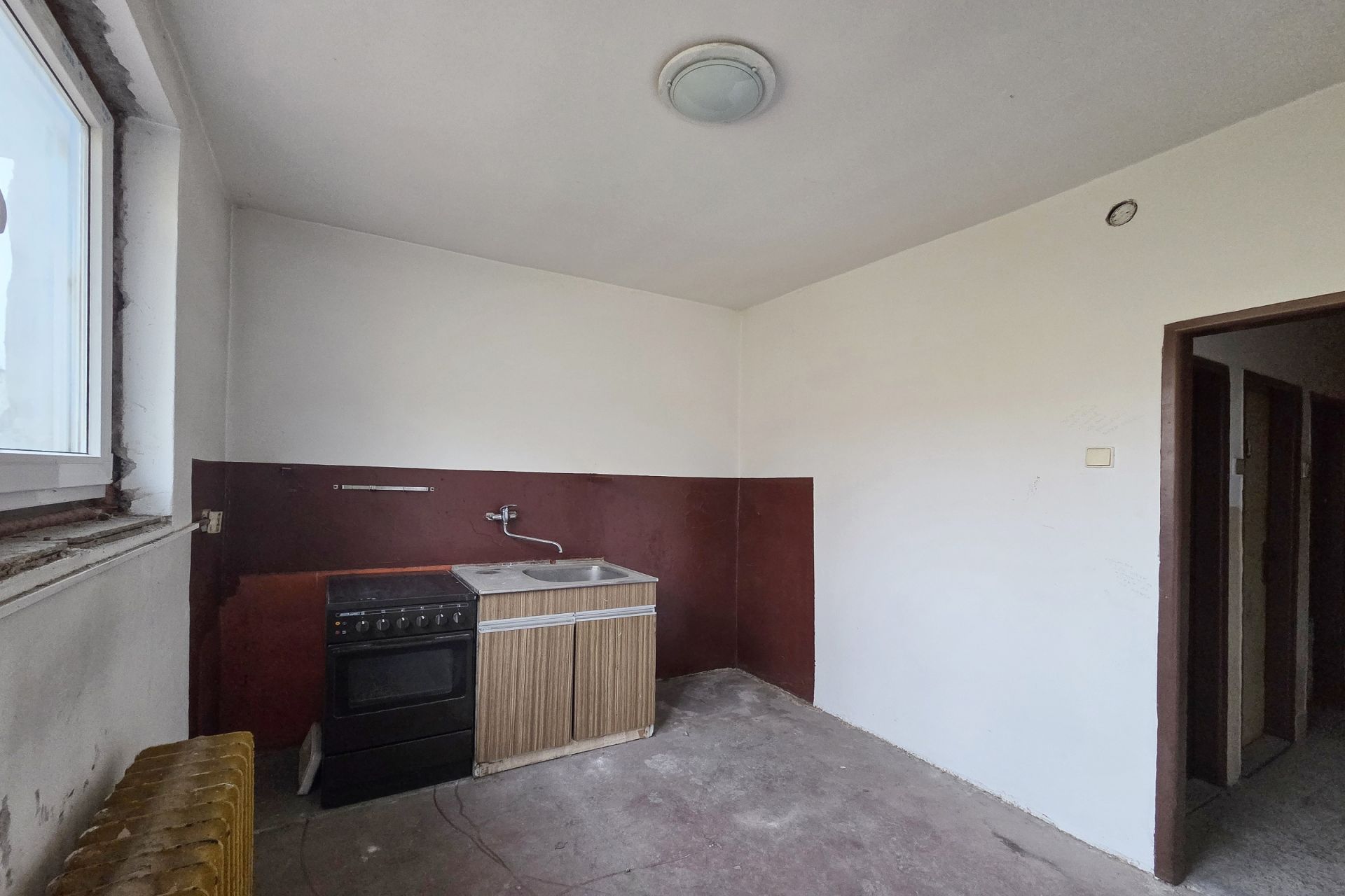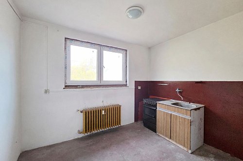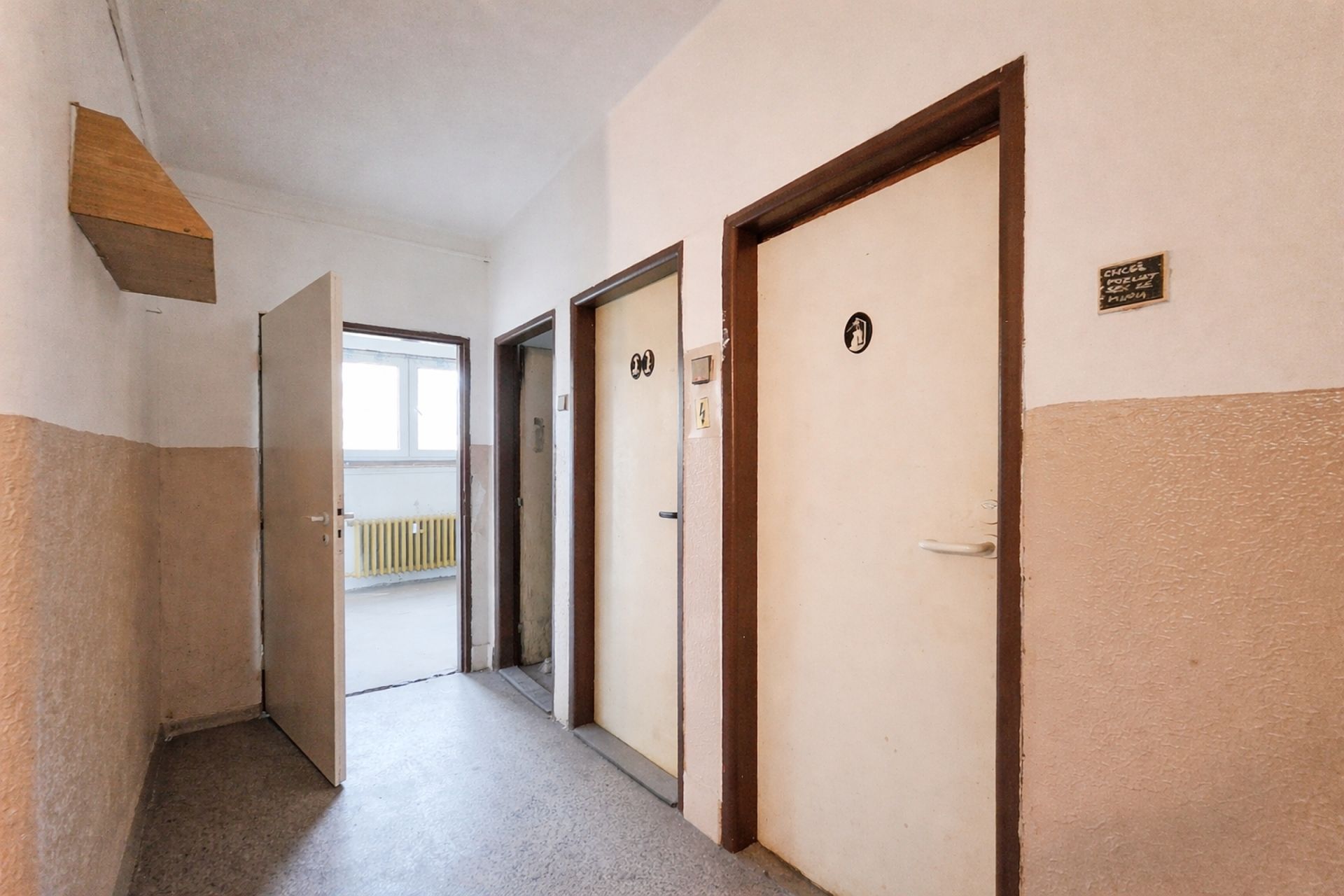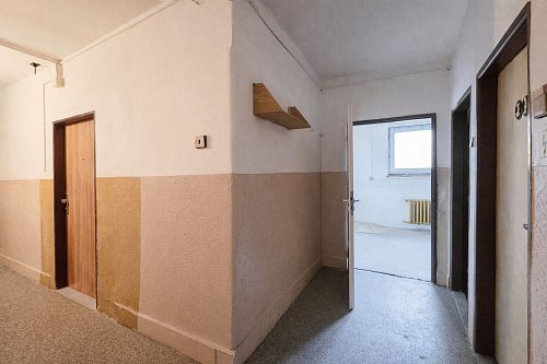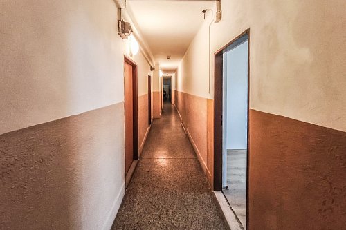 Společná kuchyně, koupelna a WC jsou umístěny přímo přes chodbu, hned vedle bytu. Tyto prostory jsou aktuálně ve stavu určeném ke kompletní rekonstrukci a v současnosti je nikdo z majitelů nevyužívá. Nemovitost je proto velmi zajímavá pro investora, který se po dohodě se zbývajícími dvěma spoluvlastníky může pustit do přestavby a vytvořit si tak plnohodnotný a atraktivní byt.