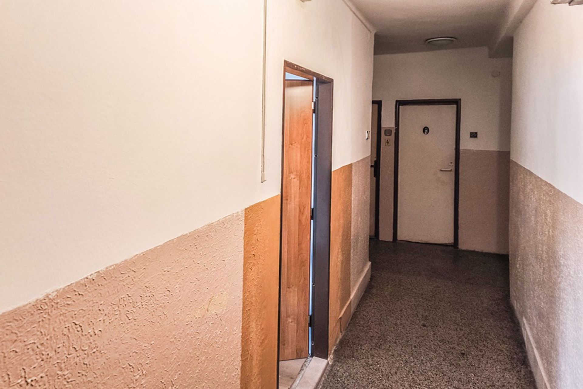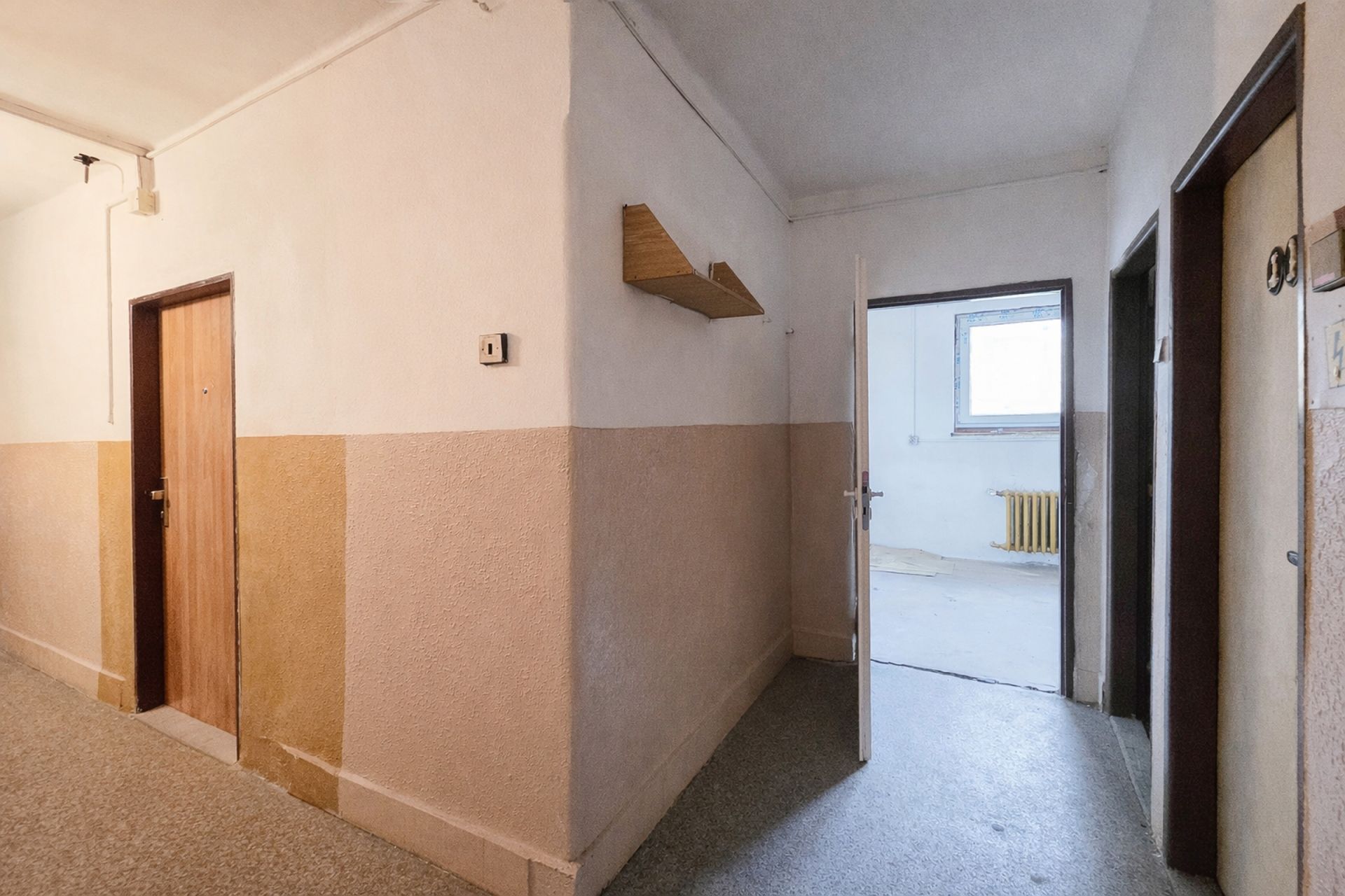 V bytě jsou již provedeny rozvody elektřiny, zbývá pouze napojení na hlavní rozvaděč na chodbě a osazení nového elektroměru.